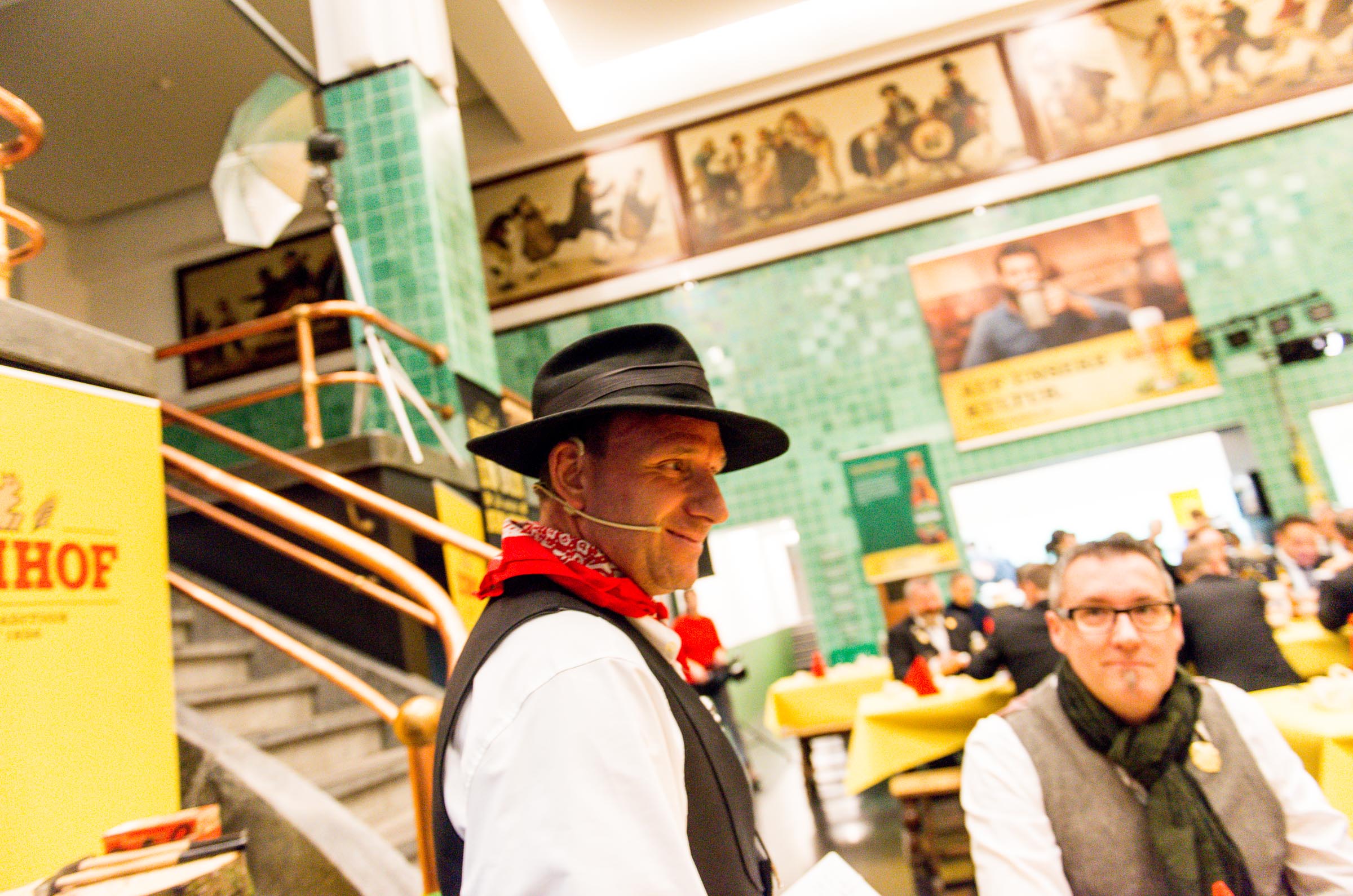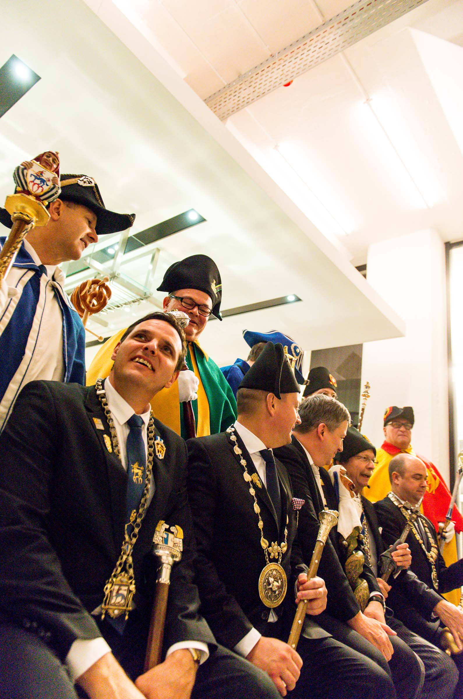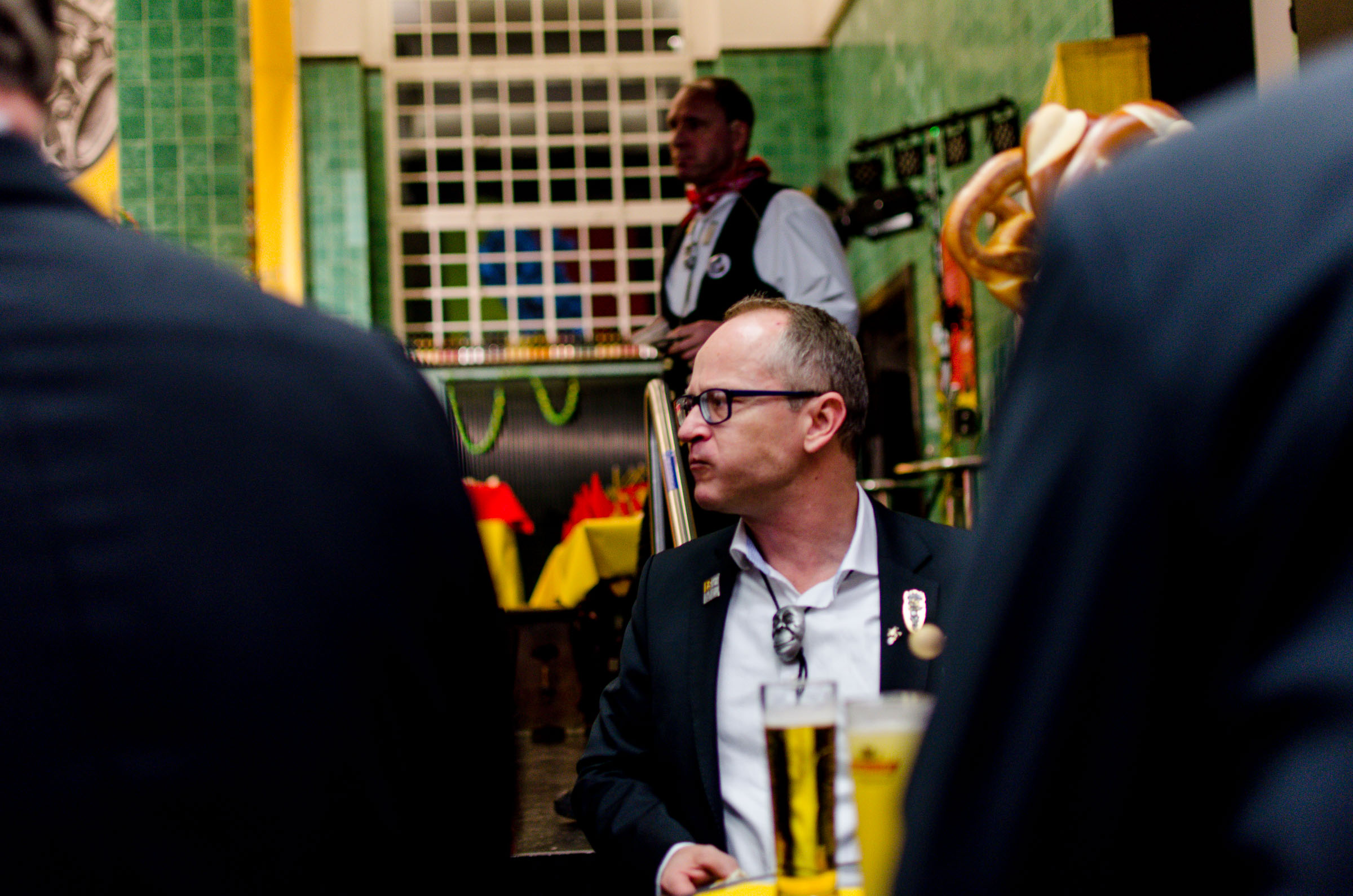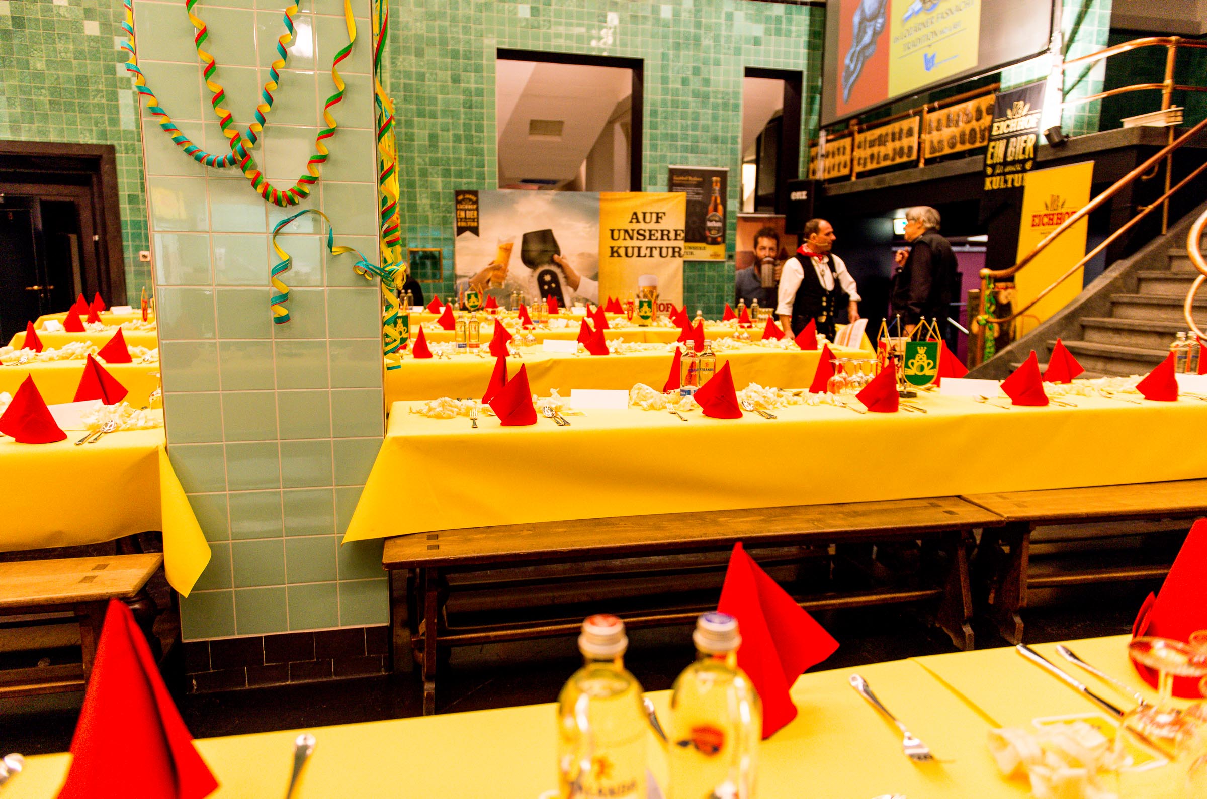 Vor dem grossen Einmarsch werden alle Details geprüft. Der Weibel hilft natürlich. Die Gäste sitzen, noch fehlen die Fasnachtsgewaltigen. Einmarsch mit Weibel und Bannerherr und Musik. Falls kein Fähndrich da ist, dann schreitet der Chef (LFK-Präsideten) gleich mit vier Bannerträgern in den Schalander ein. Man gönnt sich etwas.