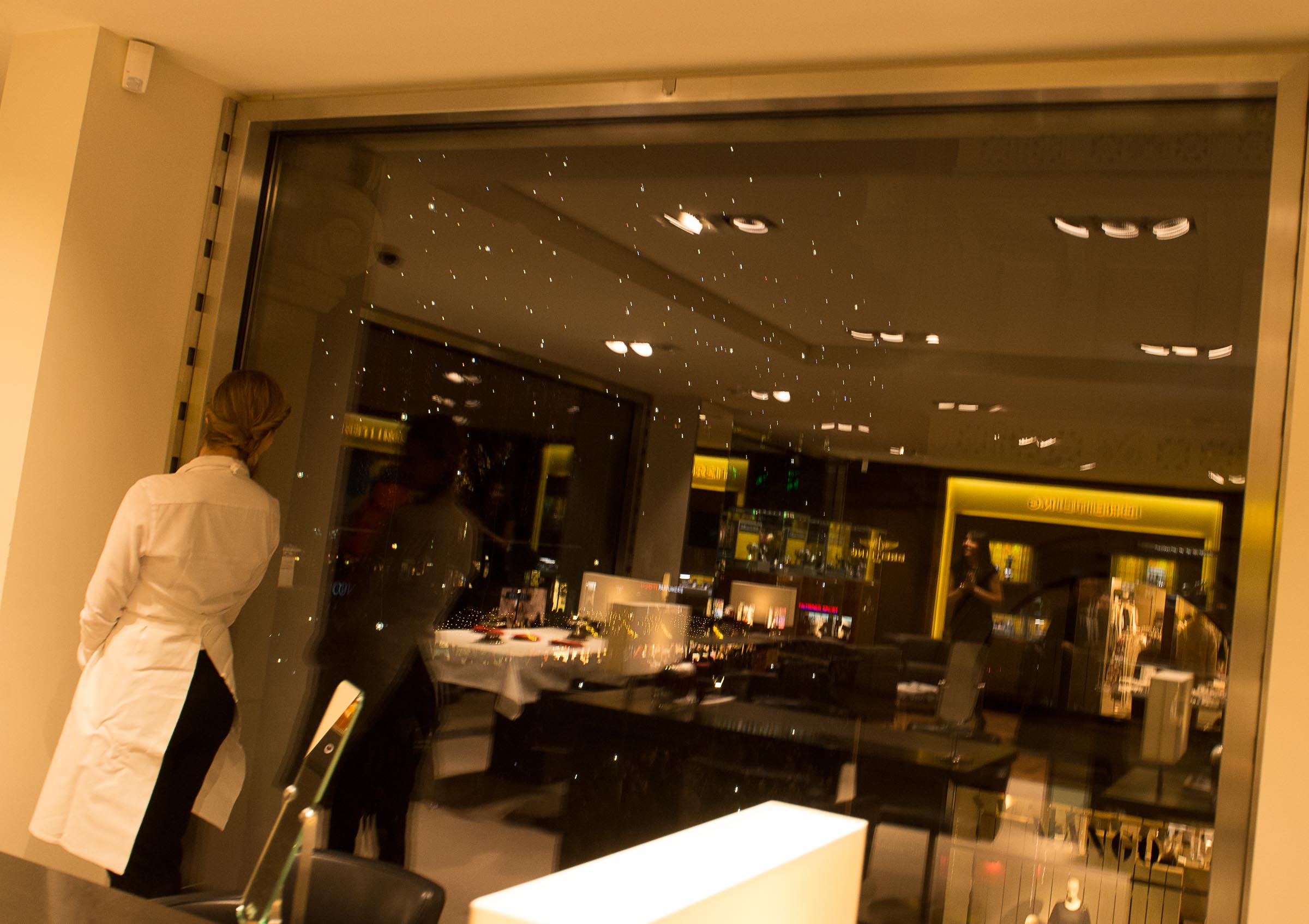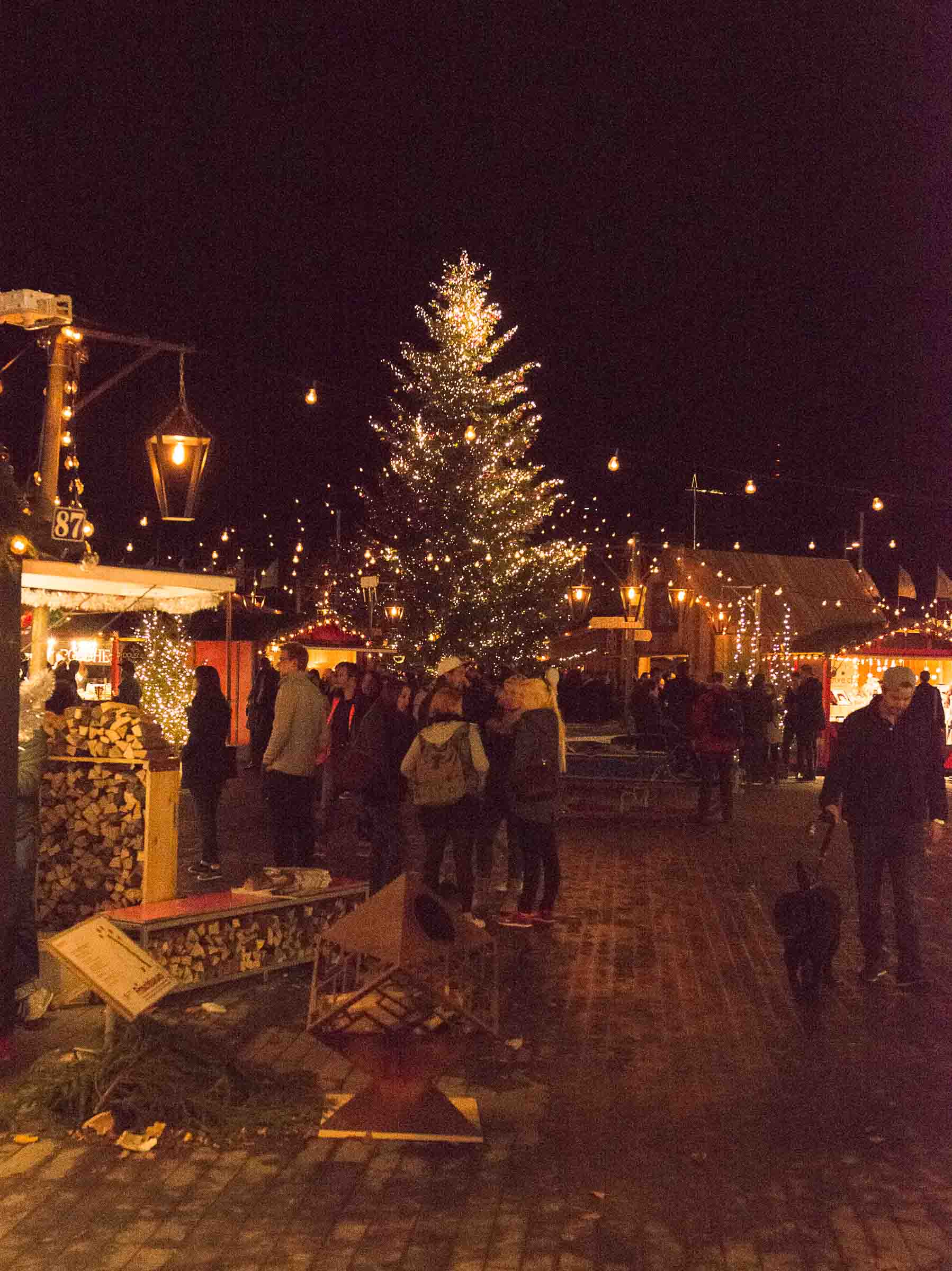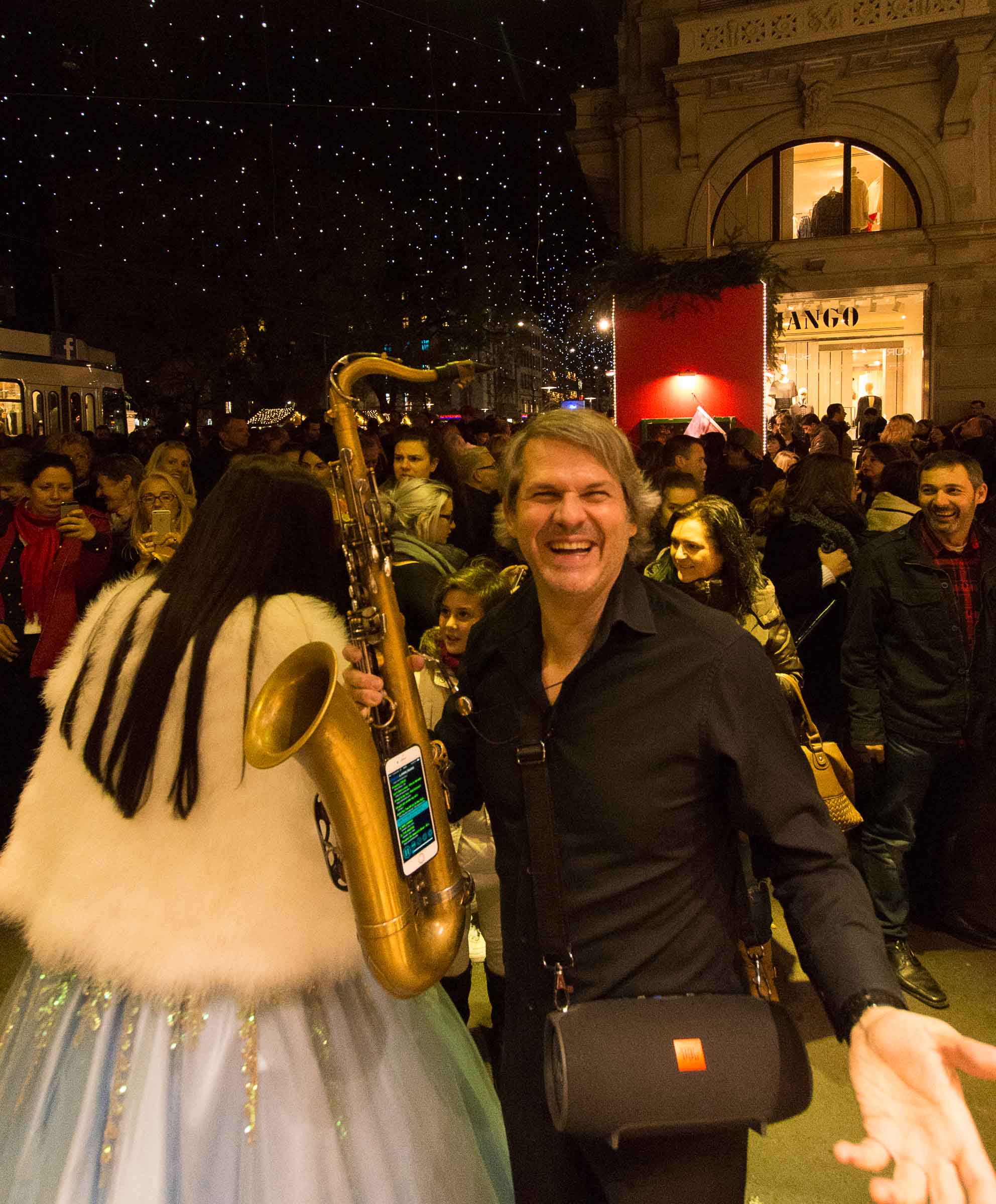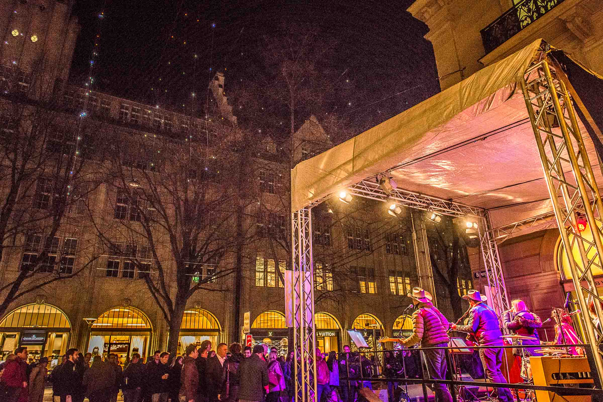fünf Minuten vor dem Einschalten der Beleuchtung, mit Ellbogen, Schieben und Stossen verbunden. Jeder wollte dabei sein. Diverse Geschäfte hatten ihre Verkaufsaktivitäten auf's Trottoir ausgedehnt. Willkommens Events für geladene Gäste und Besucher laden zum Verweilen ein. Auf der Bühne neben einer grossen Bank, die gerade umgebaut wird, steht das Volk dicht gedrängt auch noch um 21.00 Uhr.