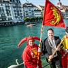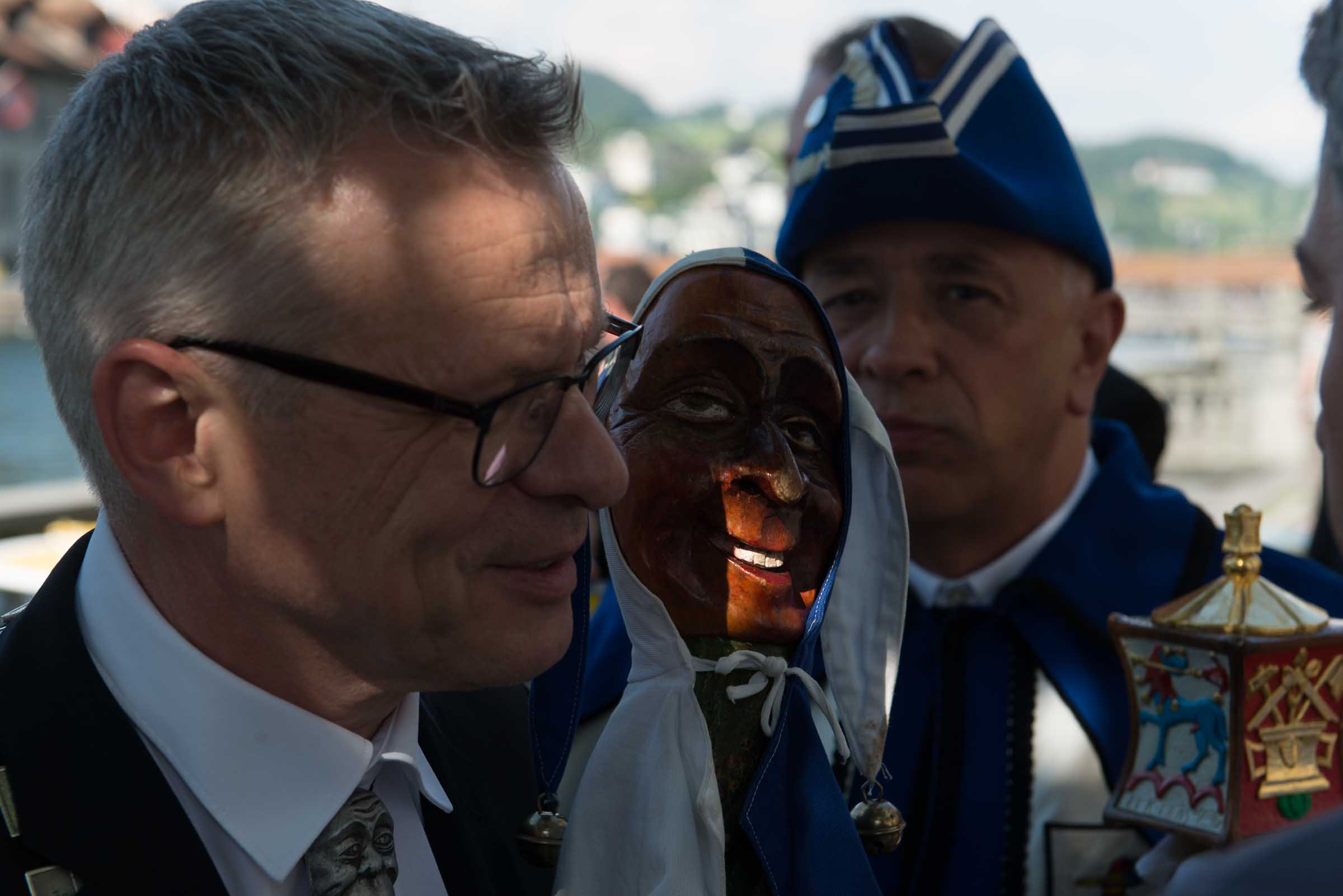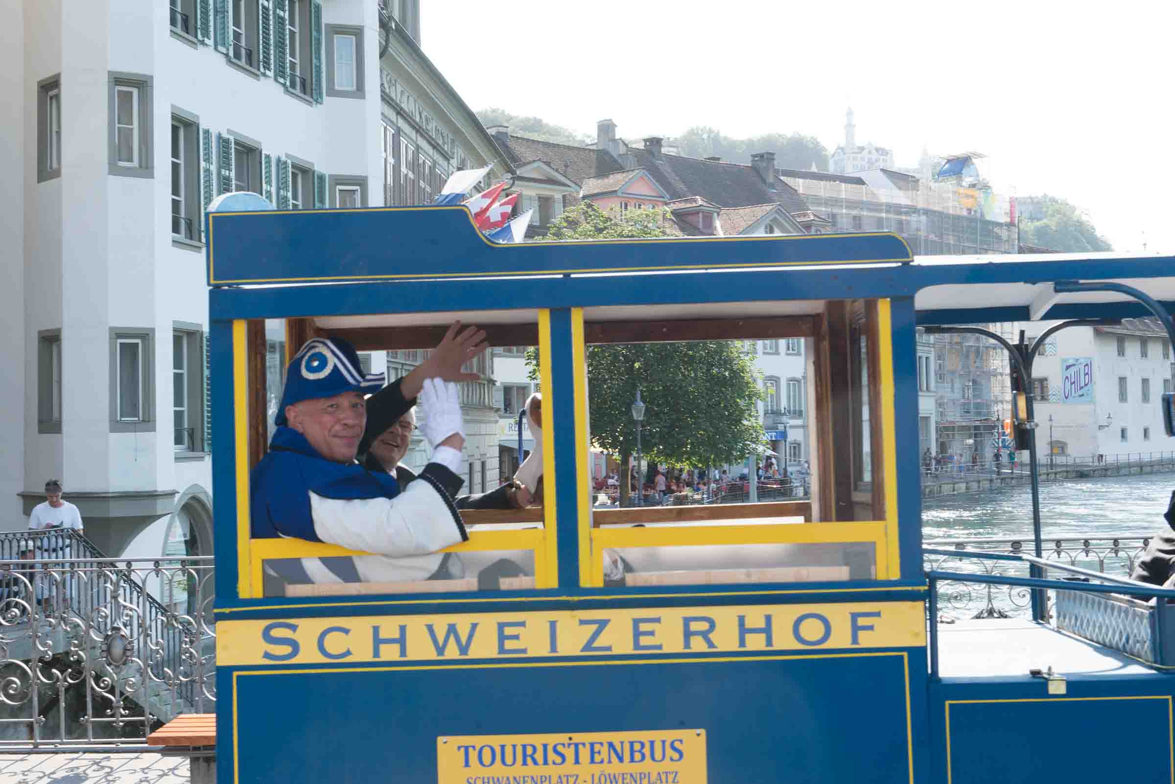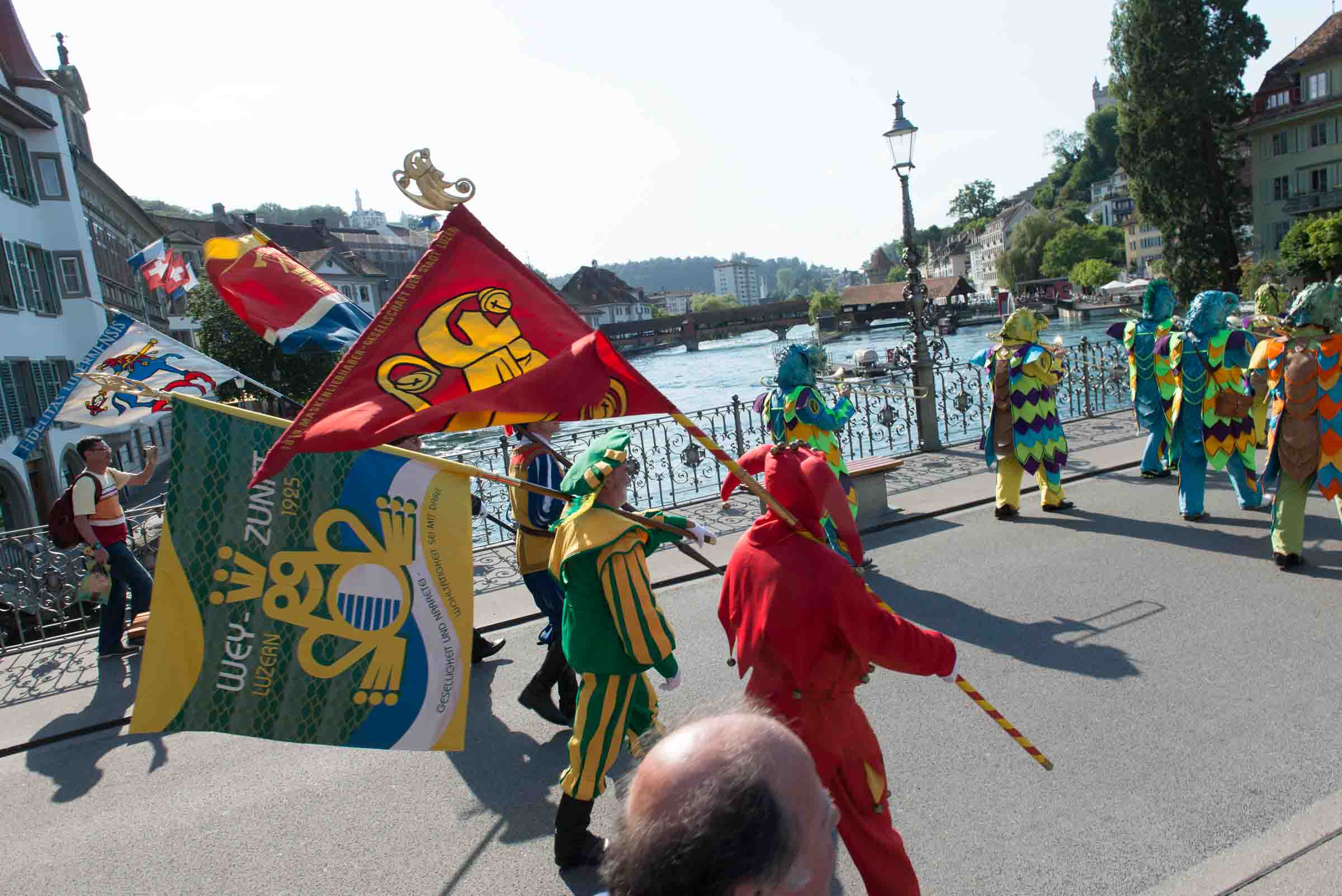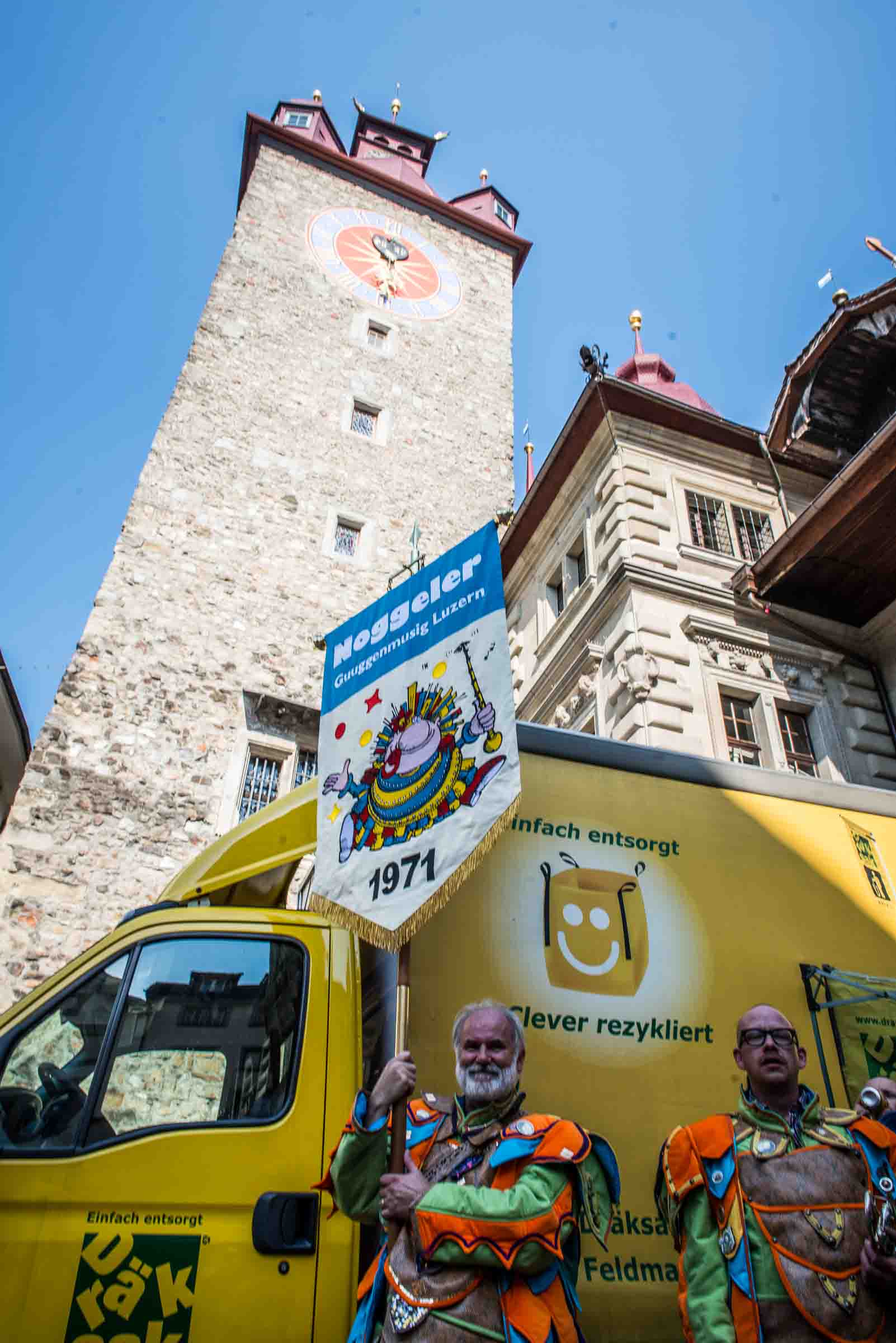 die Altstadt Luzern ziehen (im Touristenbus) und werden dann weitergereicht. Die Guggenmusik Noggeler spielt auf, die Hitze unter den Grinden ist wohl noch einige Grade höher als die angezeigten 32 Grad im Schatten. Ich tragen im Sommer und im Winter nur ein meine blauweisse Kappe. Das reicht!