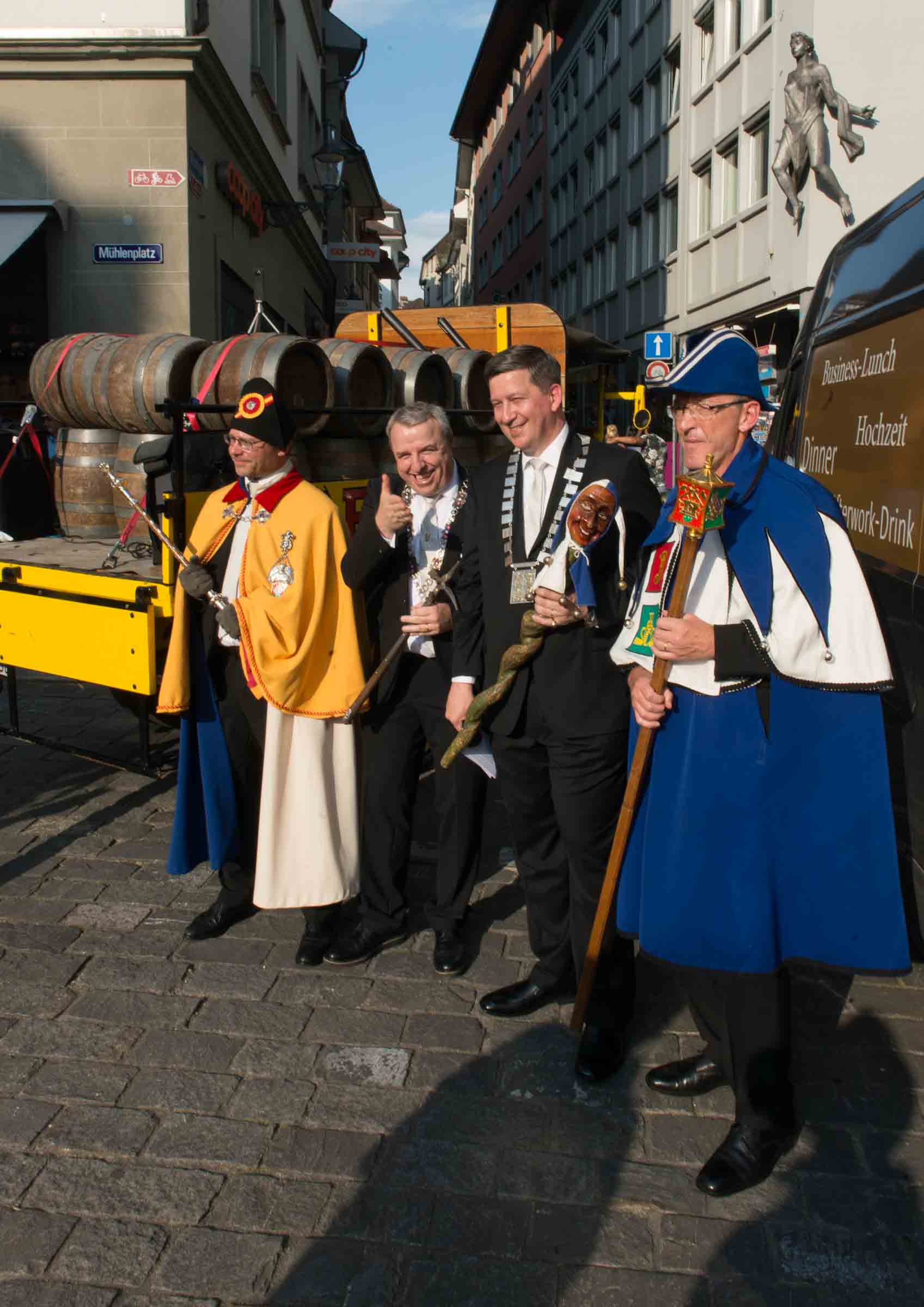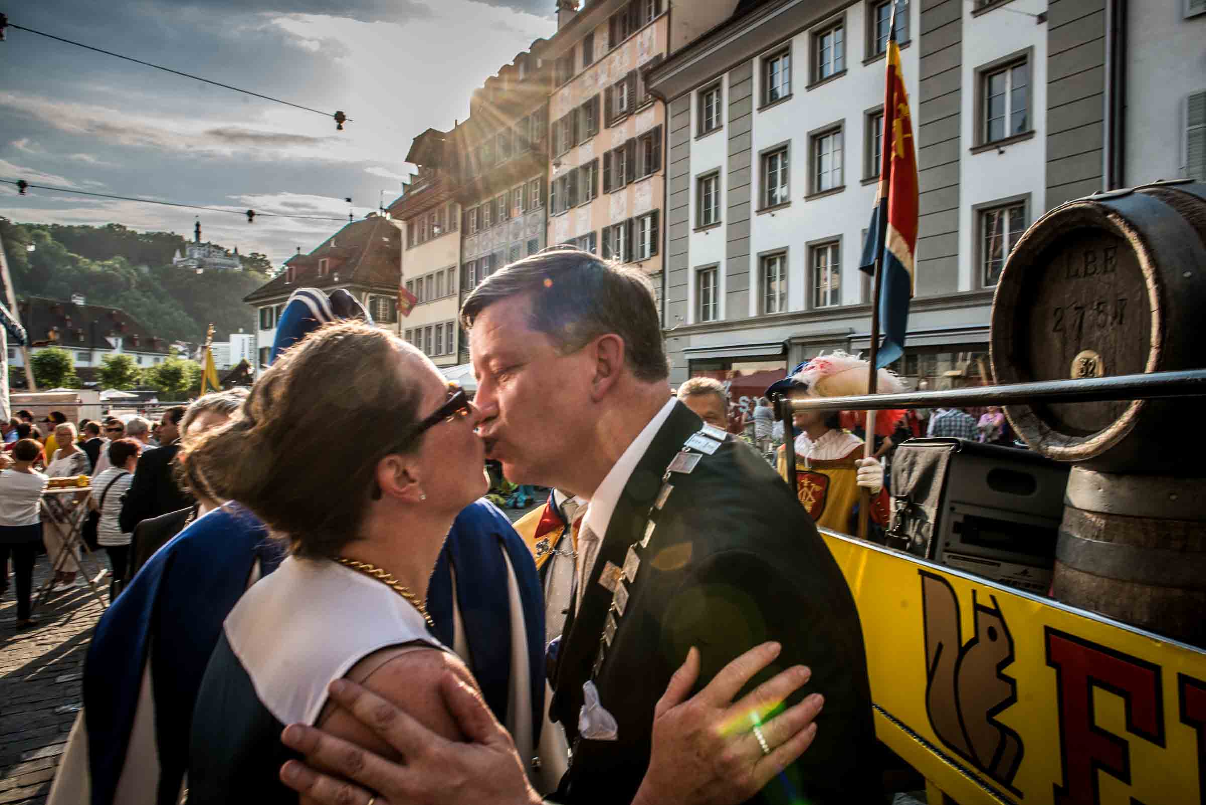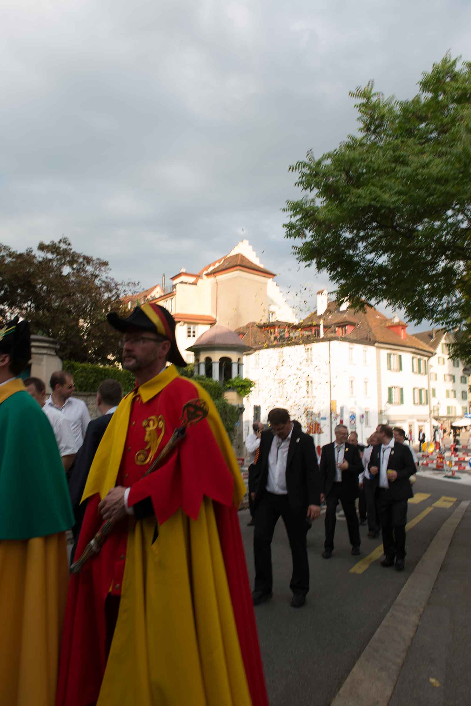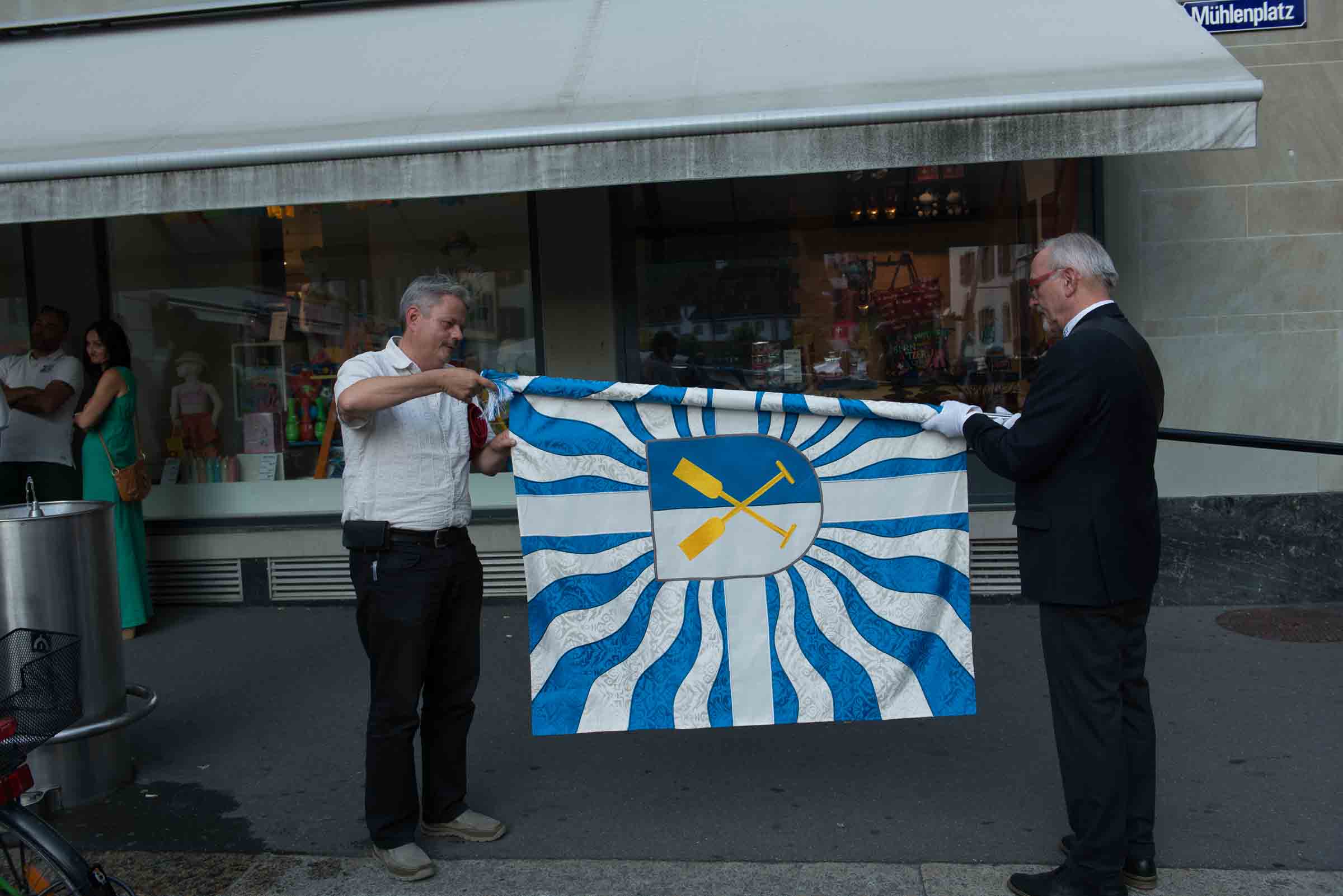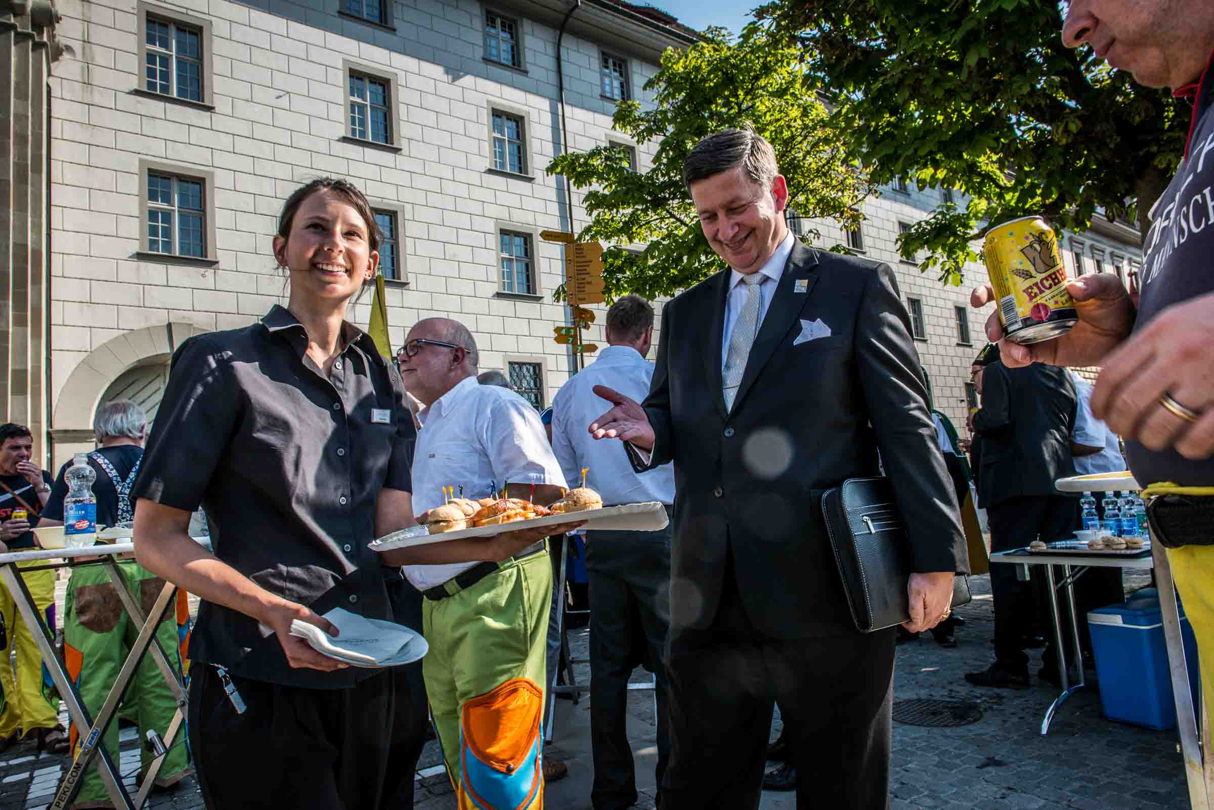 Die nächste Station ist dann wirklich bald erreicht, der Mühlenplatz. Hier endlich werde ich dem neuen Präsidenten vorgesellt. Der Weibel wird eingekleidet. Und hier findet der Apero für die vielen Zaungäste statt.