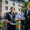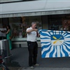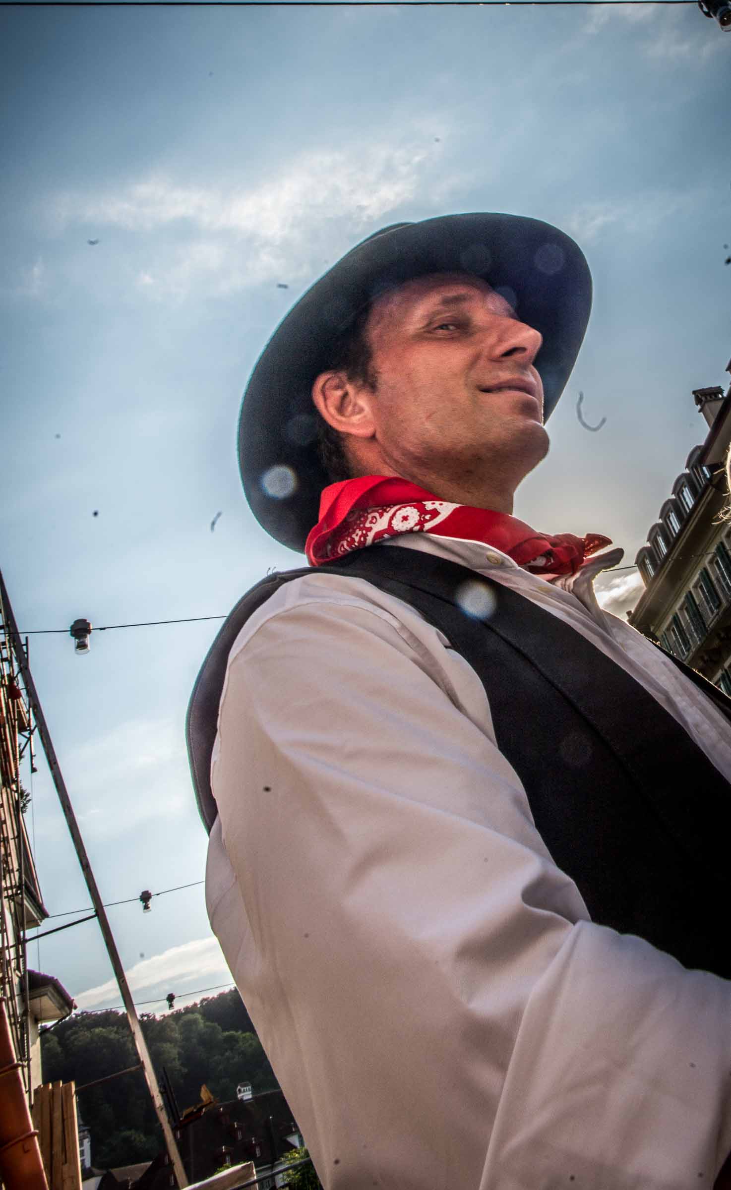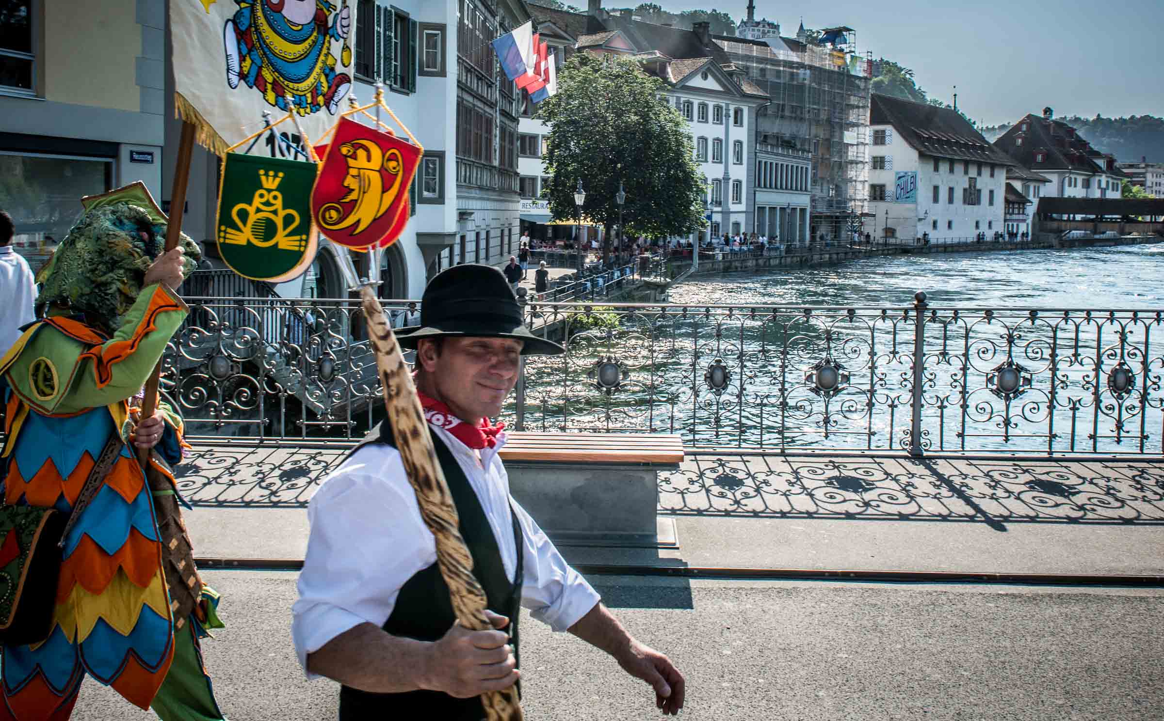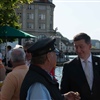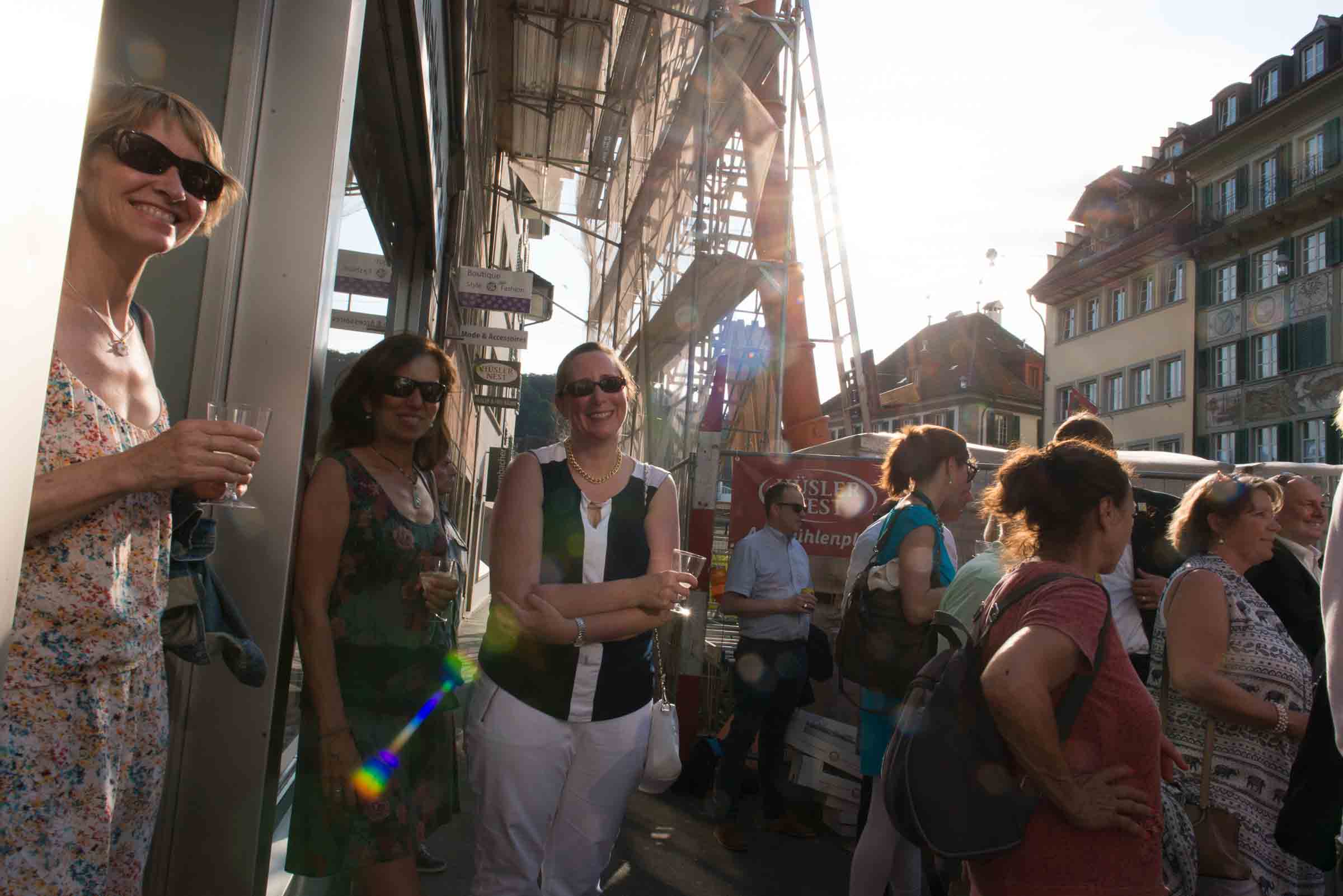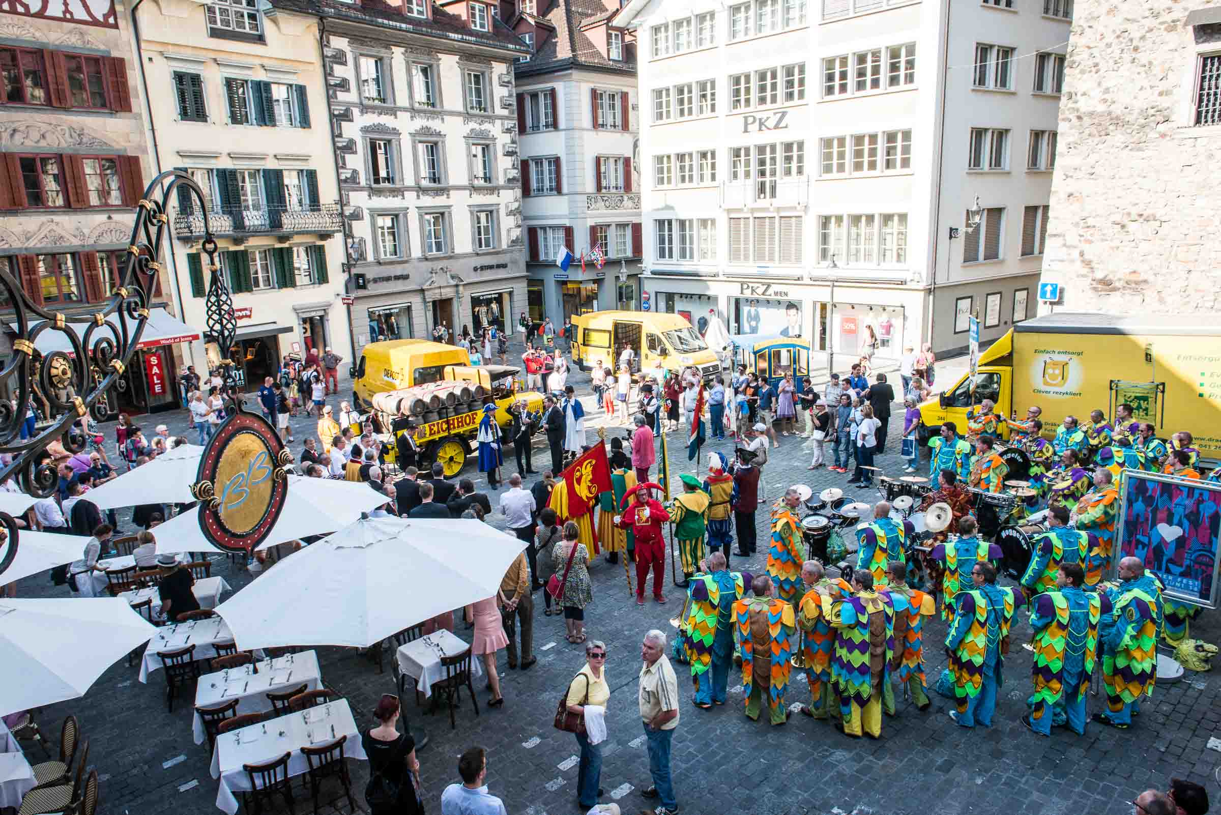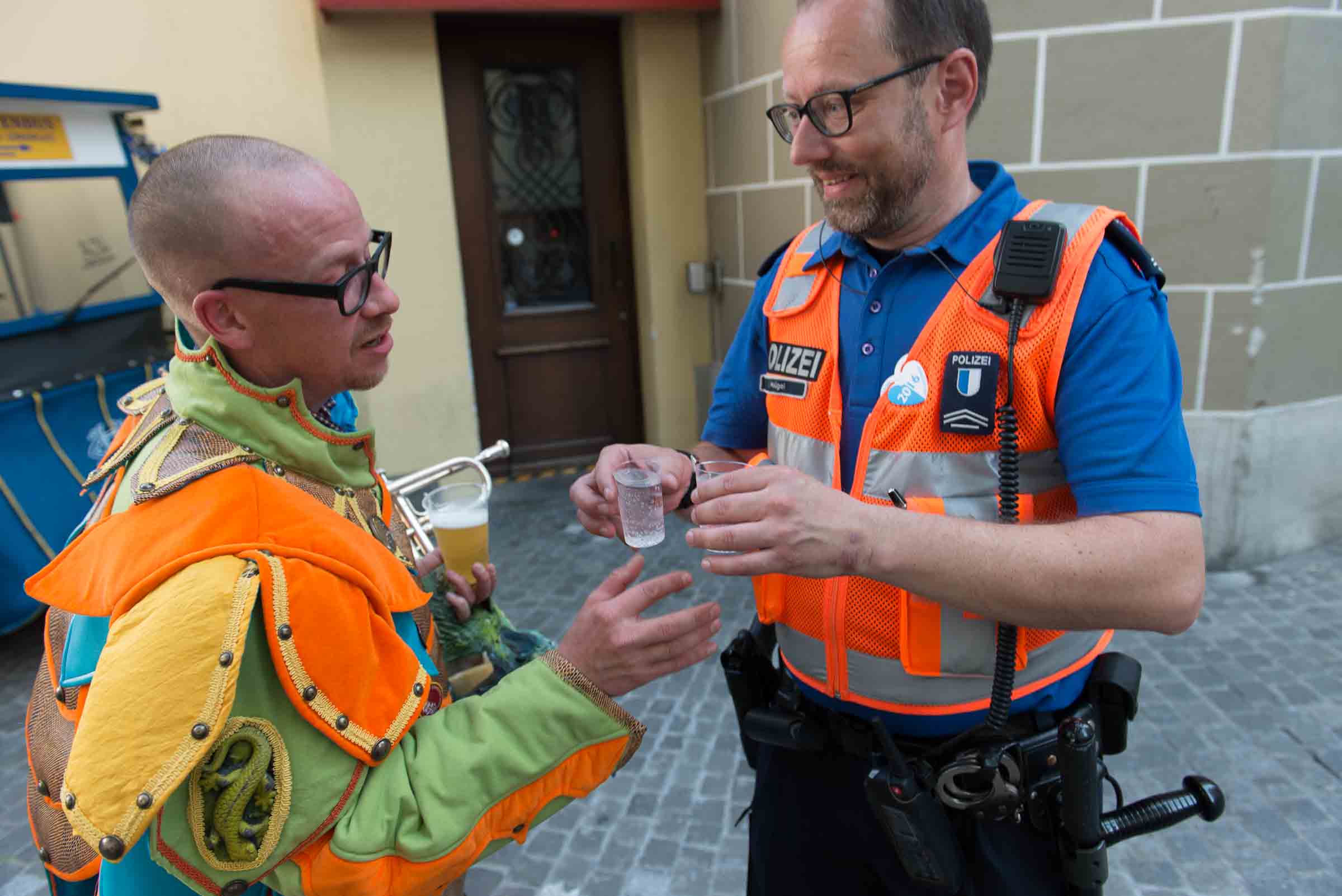 Die nächste Station ist dann wirklich bald erreicht, der Mühlenplatz. Hier endlich werde ich dem neuen Präsidenten vorgesellt. Der Weibel wird eingekleidet. Und hier findet der Apero für die vielen Zaungäste statt.